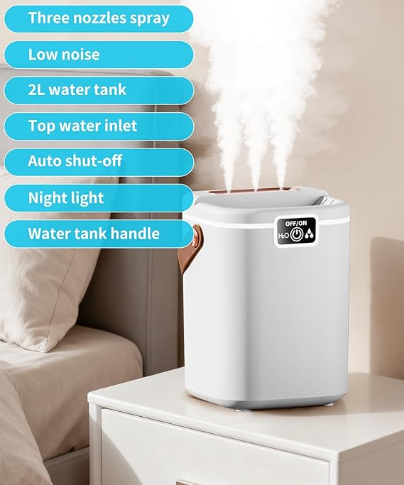 1: 2L large capacity, long battery life, no need to frequently add water, dual filter element filtration, three nozzles, multi speed adjustment, small night light can be used to turn off regularly at night.